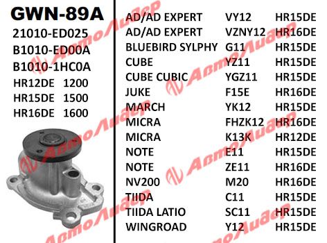 Помпа системы охлаждения / GMB для Nissan AD EXPERT BLUEBIRD SYLPHY CUBE CUBIC JUKE F15E MARCH NOTE NV200 VANETTE TIIDA WINGROAD; GWN-89A; (TG-MCP0046 RU4A ) 21010ED025 B1010ED00A B10101HC0A
